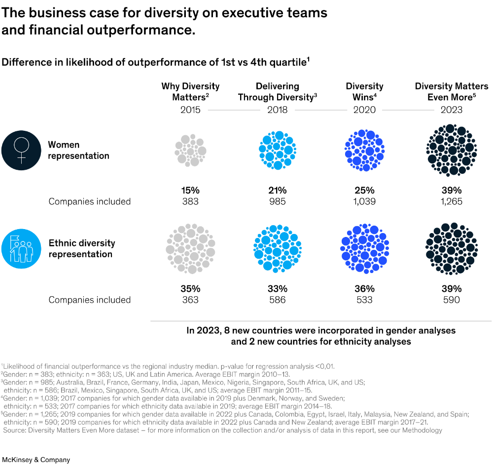 McKinsey has consistently studied the impact of gender and ethnic diversity within teams from 2015. According to their latest study, diversity now matters even more than before. Top-quartile companies have a 39 percent greater likelihood of financial outperformance versus their bottom-quartile peers.